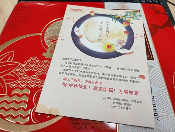 在2022年中秋佳節(jié)來臨之際,為感謝員工的辛勤付出,提前營造溫馨、和諧的節(jié)日氛圍,邁騰電子及各地區(qū)子公司、分公司給全體員工發(fā)放中秋月餅福利,為員工及其家屬送上佳節(jié)的問候和美好的節(jié)日祝福。