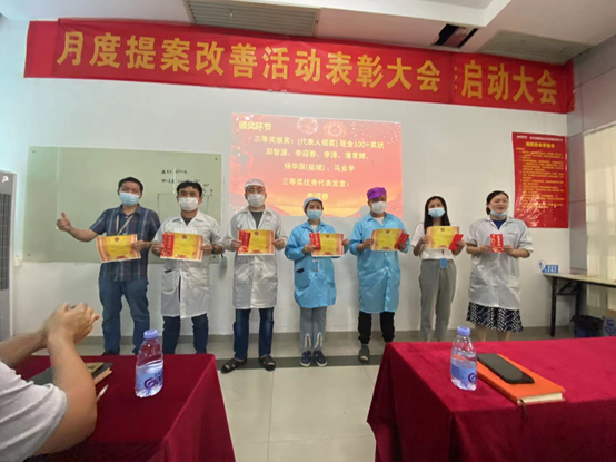 3月份,共收到員工提出172項提案,經(jīng)各評審小組審核評選,最終角逐出一等獎1名,二等獎3名,三等獎6名,評審小組成員分別為優(yōu)秀提案改善項目人員頒發(fā)榮譽證書、獎金,并合影留念。